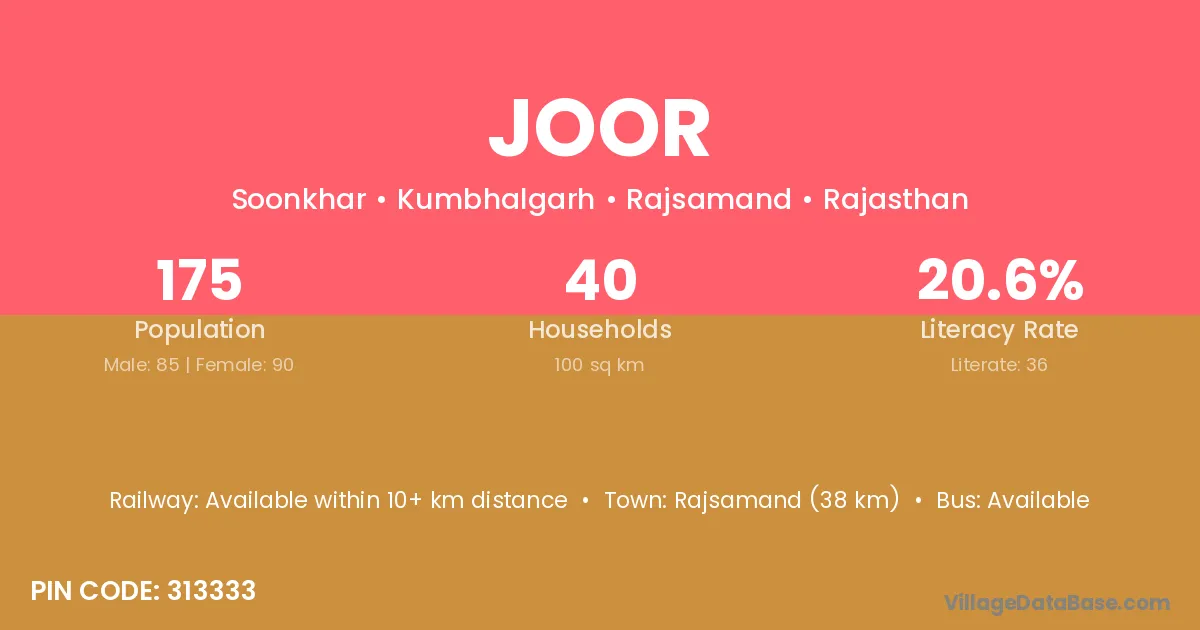 The literacy rate of Joor village is 48.08%. Male literacy stands at 61.16% and female literacy at 32.91%.