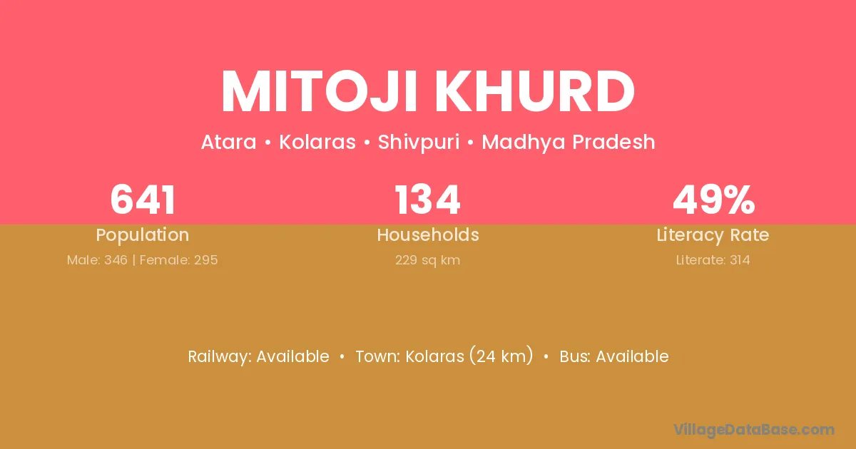 Kolaras (24 km) is the nearest town to Mitoji Khurd village for major economic activities and is located approximately 24 km away.