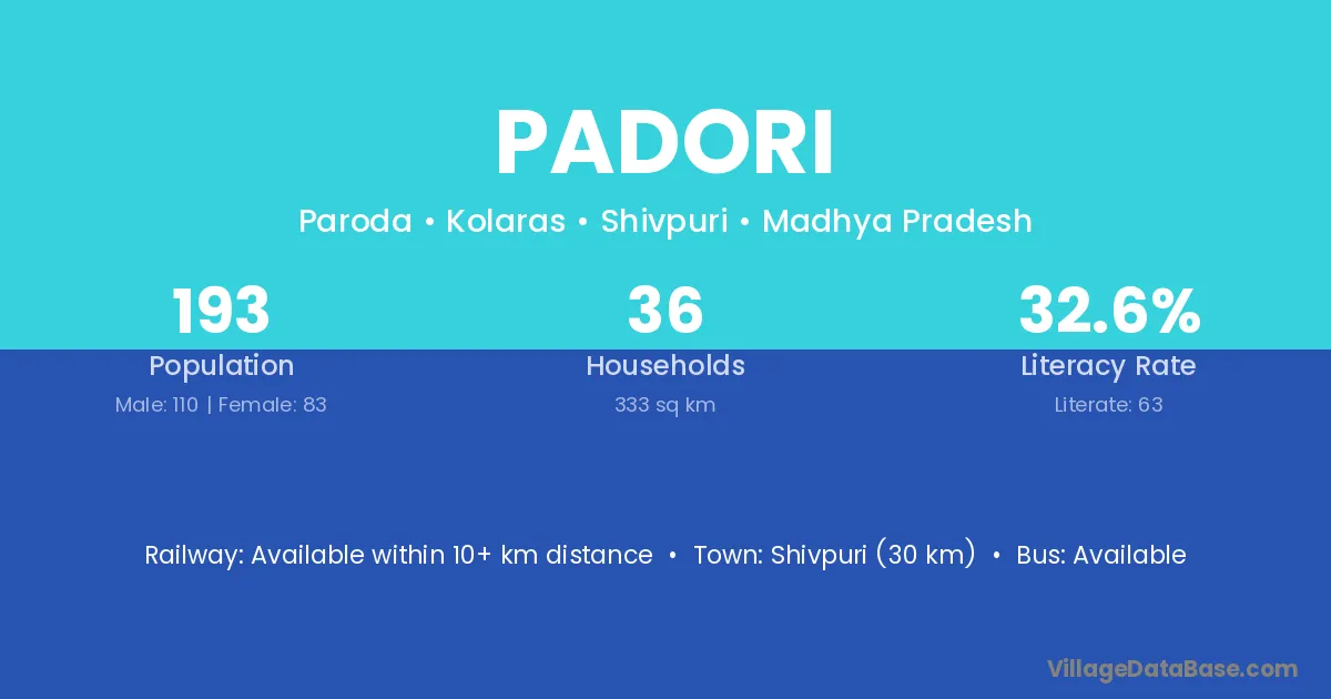 Shivpuri (30 km) is the nearest town to Padori village for major economic activities and is located approximately 30 km away.