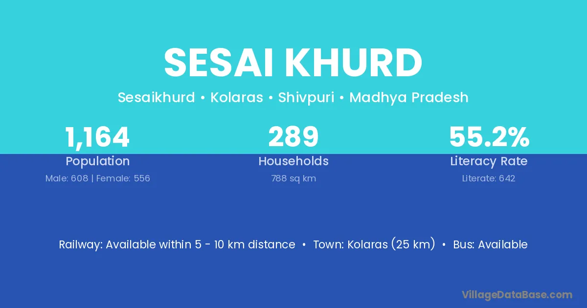 Kolaras (25 km) is the nearest town to Sesai Khurd village for major economic activities and is located approximately 25 km away.