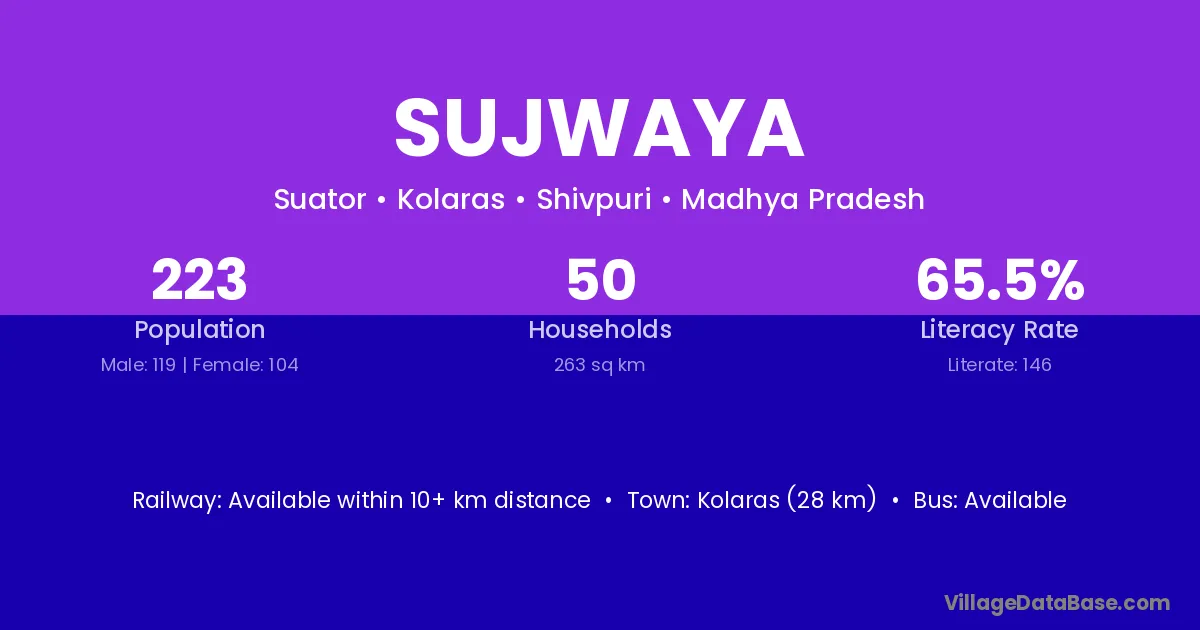 Kolaras (28 km) is the nearest town to Sujwaya village for major economic activities and is located approximately 28 km away.