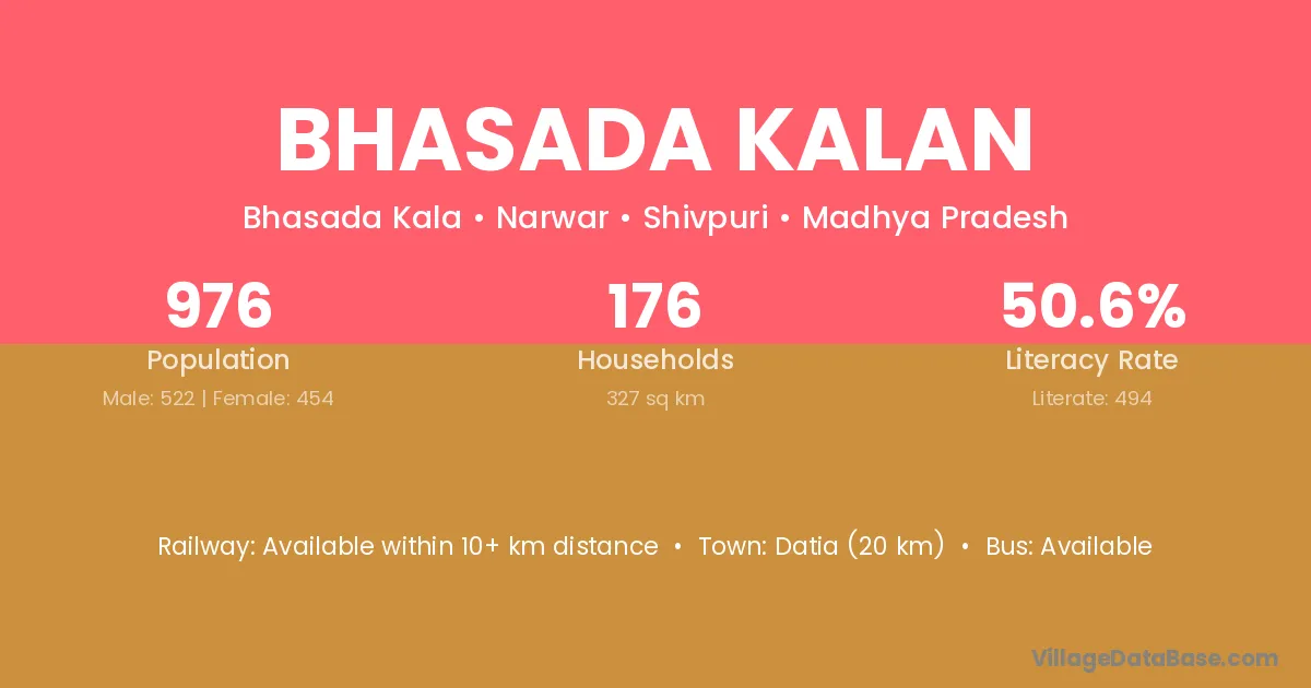 Datia (20 km) is the nearest town to Bhasada Kalan village for major economic activities and is located approximately 20 km away.