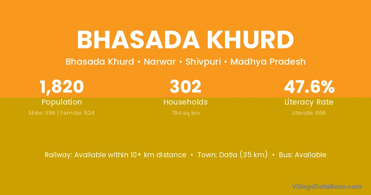 Bhasada Khurd village has a total population of 1,820 people, of which 996 are males and 824 are females.