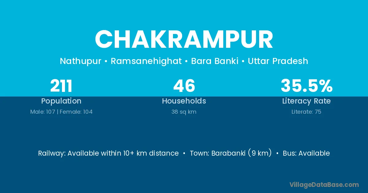 The literacy rate of Chakrampur village is 51.35%. Male literacy stands at 63.95% and female literacy at 36.87%.