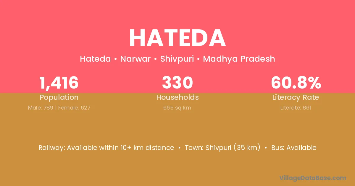 Shivpuri (35 km) is the nearest town to Hateda village for major economic activities and is located approximately 35 km away.