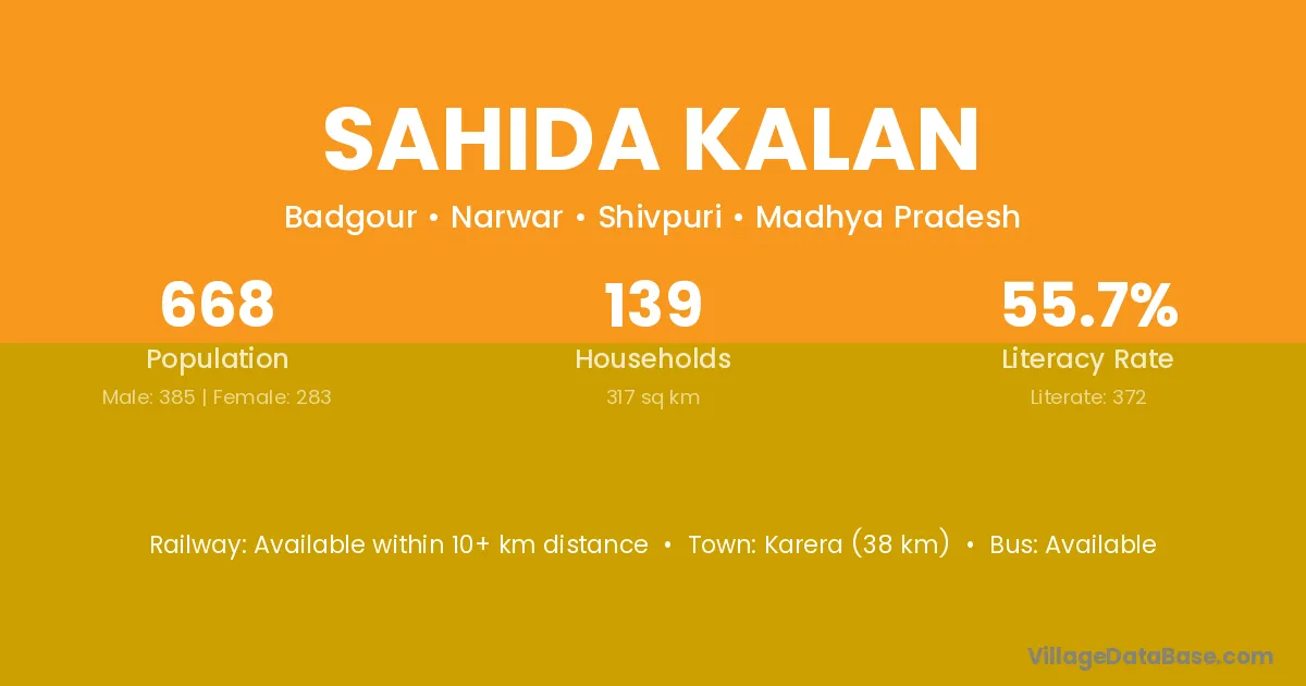 Karera (38 km) is the nearest town to Sahida Kalan village for major economic activities and is located approximately 38 km away.