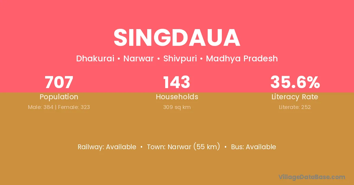 Narwar (55 km) is the nearest town to Singdaua village for major economic activities and is located approximately 55 km away.