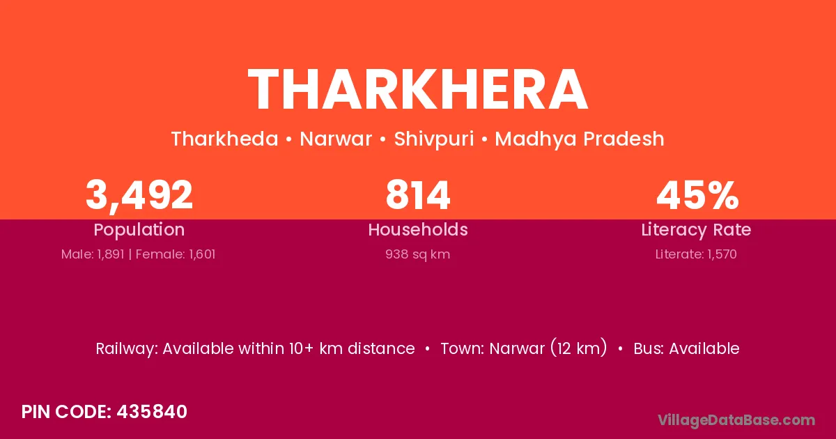 Narwar (12 km) is the nearest town to Tharkhera village for major economic activities and is located approximately 12 km away.