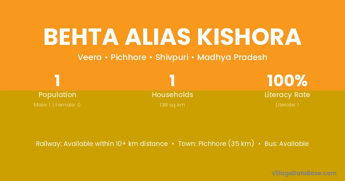 Pichhore (35 km) is the nearest town to Behta Alias Kishora village for major economic activities and is located approximately 35 km away.