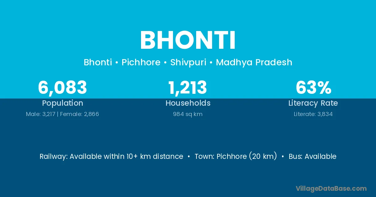 Pichhore (20 km) is the nearest town to Bhonti village for major economic activities and is located approximately 20 km away.