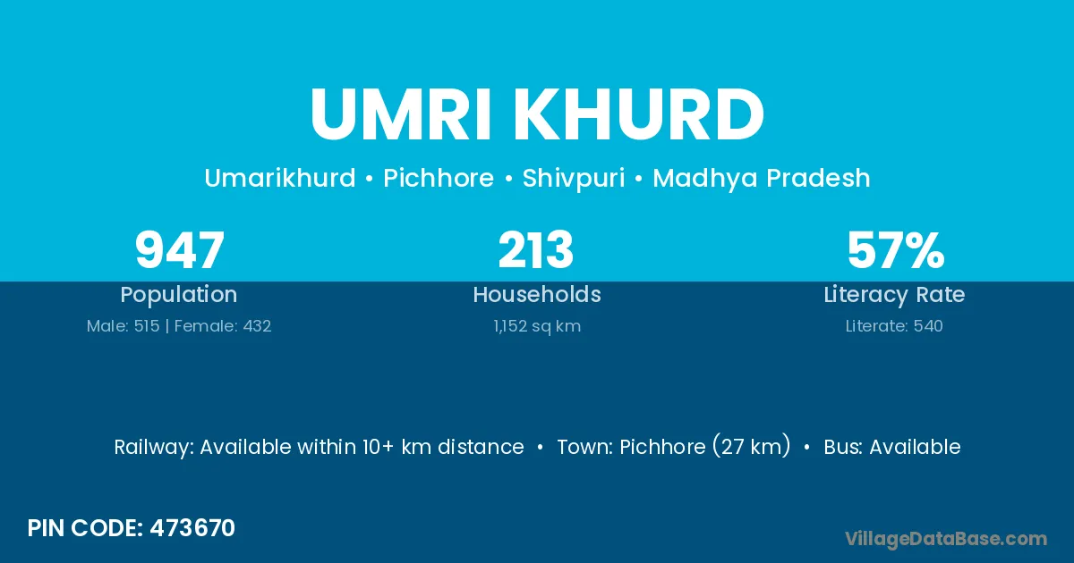Pichhore (27 km) is the nearest town to Umri Khurd village for major economic activities and is located approximately 27 km away.