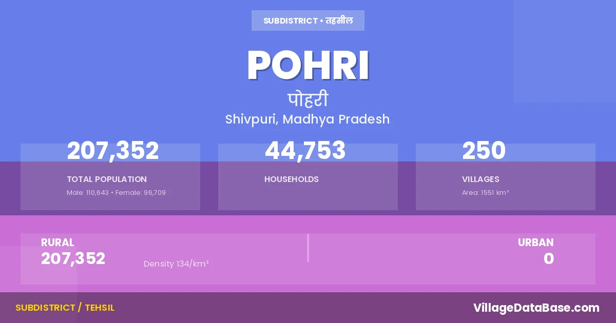 According to the 2011 census The total area of Pohri Tehsil is 1551 km², with a population of 207352 people. The population density is 134 inhabitants per square kilometre, and there are approximately 44753 houses in the sub district.