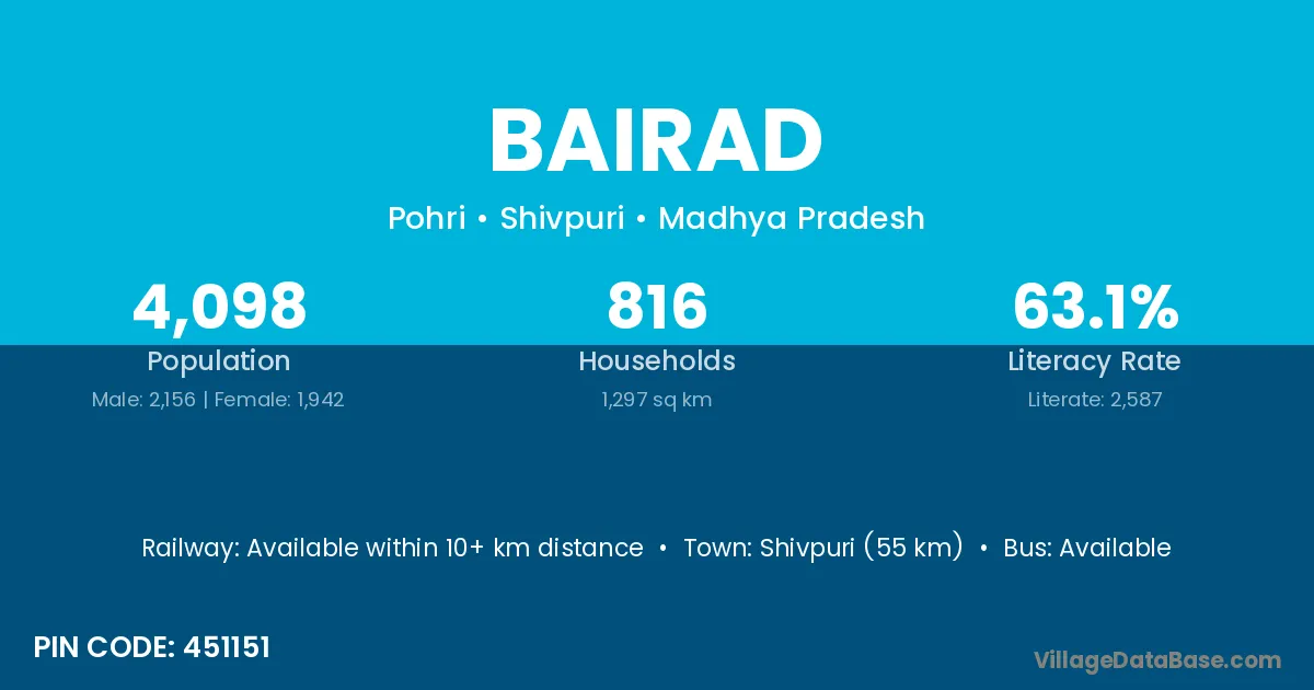 Shivpuri (55 km) is the nearest town to Bairad village for major economic activities and is located approximately 55 km away.
