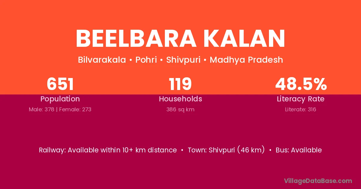 Shivpuri (46 km) is the nearest town to Beelbara Kalan village for major economic activities and is located approximately 46 km away.
