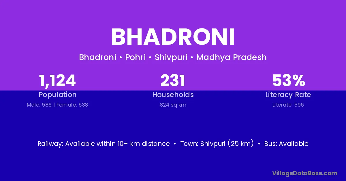 Shivpuri (25 km) is the nearest town to Bhadroni village for major economic activities and is located approximately 25 km away.