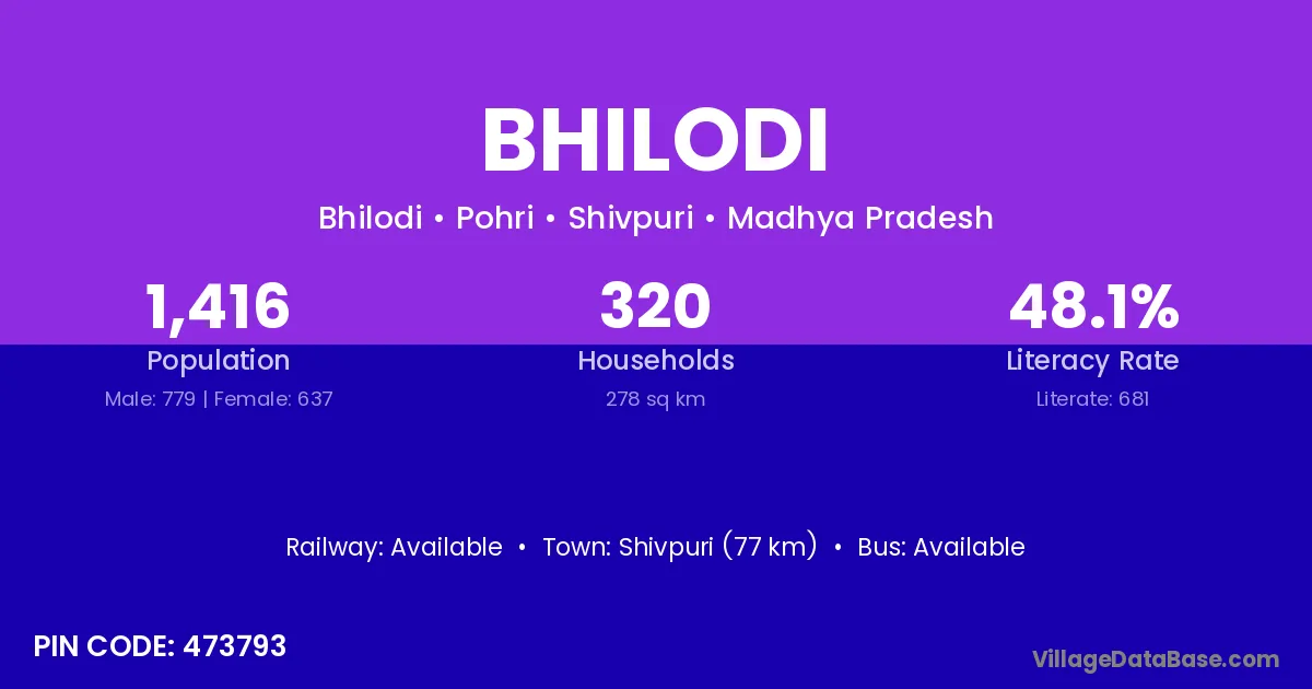 Shivpuri (77 km) is the nearest town to Bhilodi village for major economic activities and is located approximately 77 km away.