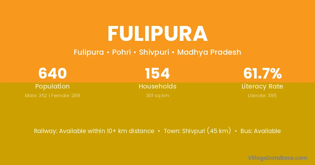 Shivpuri (45 km) is the nearest town to Fulipura village for major economic activities and is located approximately 45 km away.