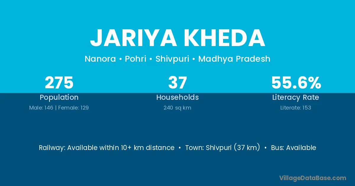 Shivpuri (37 km) is the nearest town to Jariya Kheda village for major economic activities and is located approximately 37 km away.