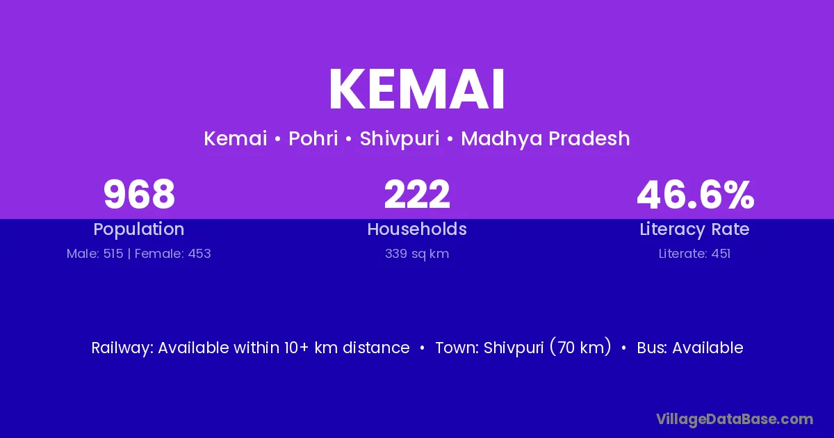 Shivpuri (70 km) is the nearest town to Kemai village for major economic activities and is located approximately 70 km away.