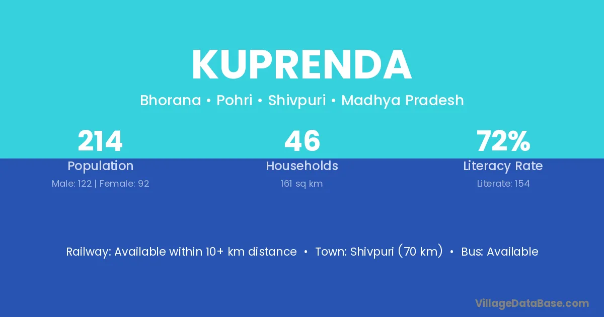 Shivpuri (70 km) is the nearest town to Kuprenda village for major economic activities and is located approximately 70 km away.