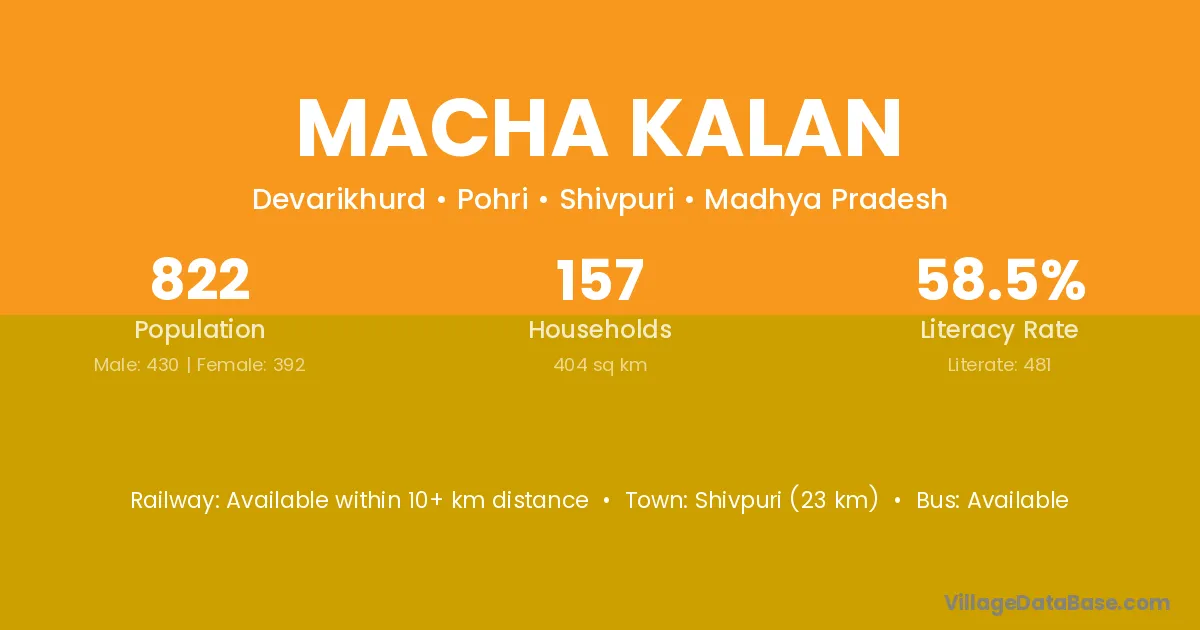 Shivpuri (23 km) is the nearest town to Macha Kalan village for major economic activities and is located approximately 23 km away.