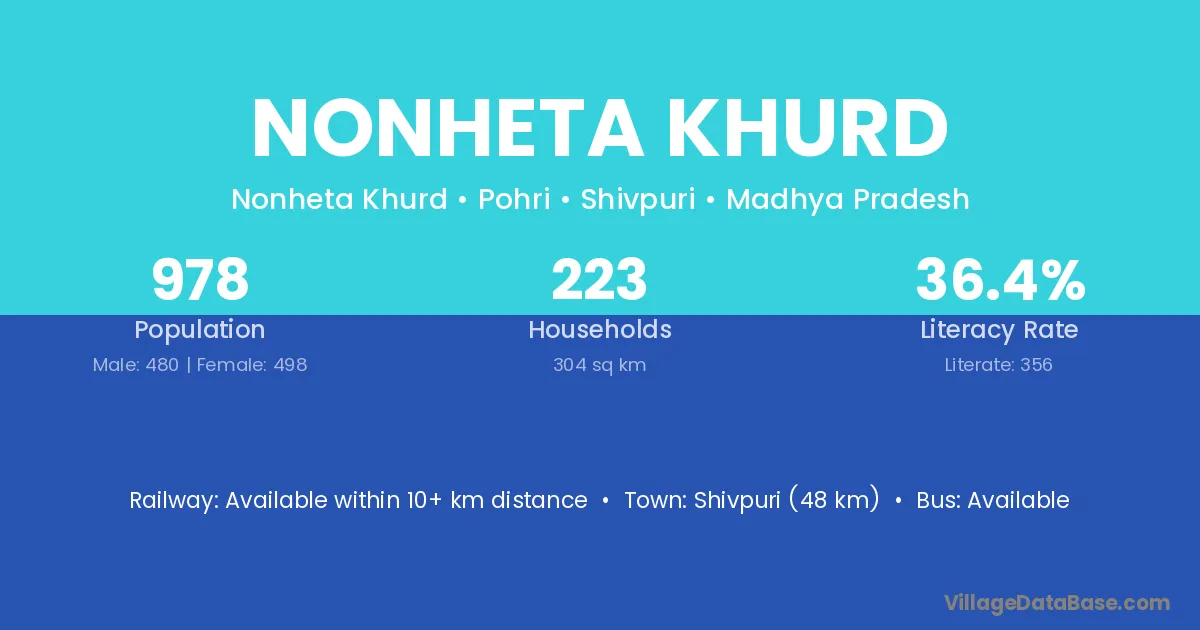 Shivpuri (48 km) is the nearest town to Nonheta Khurd village for major economic activities and is located approximately 48 km away.
