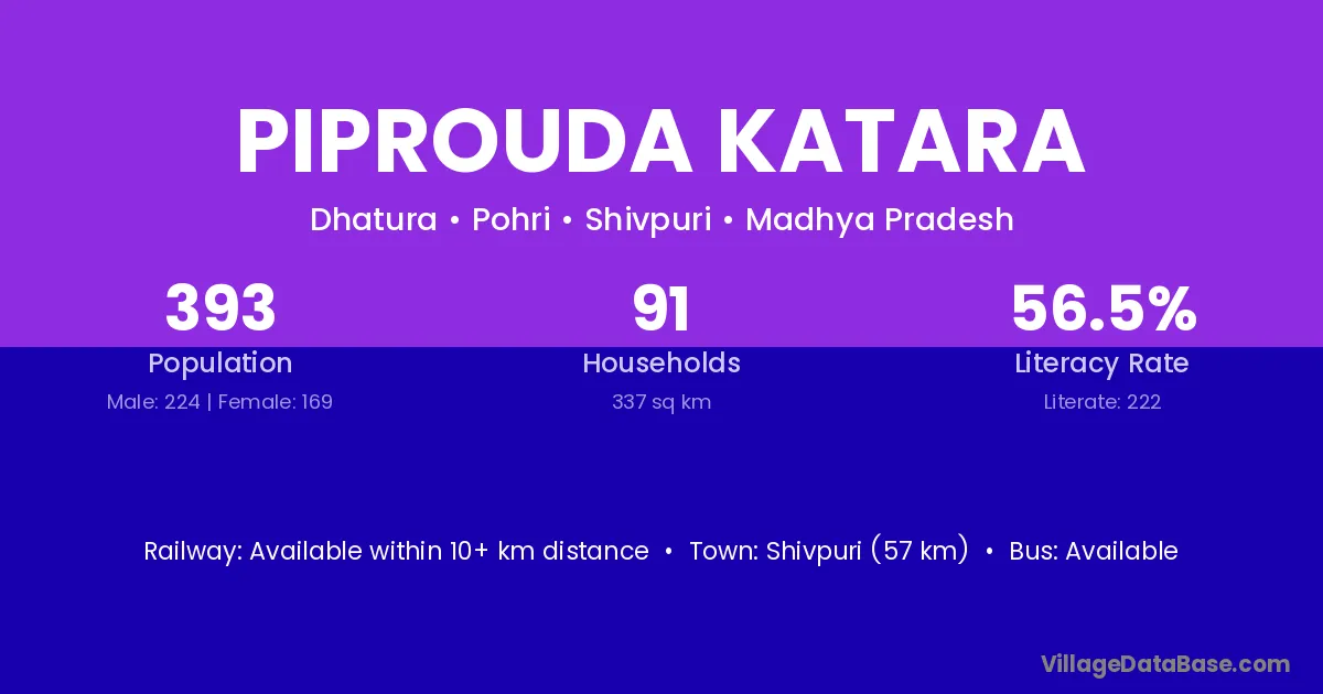 Shivpuri (57 km) is the nearest town to Piprouda Katara village for major economic activities and is located approximately 57 km away.