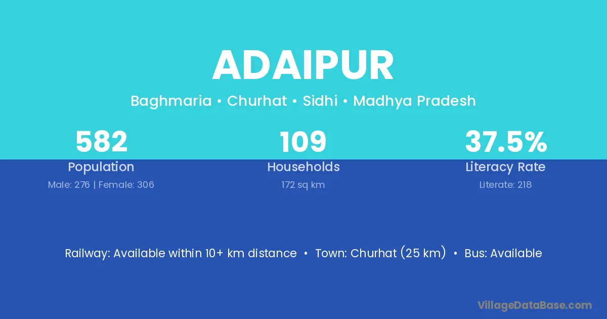 Churhat (25 km) is the nearest town to Adaipur village for major economic activities and is located approximately 25 km away.