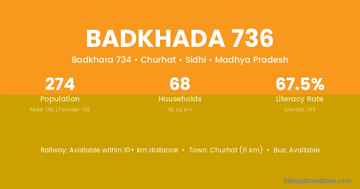 Badkhada 736 village has a total population of 274 people, of which 142 are males and 132 are females.