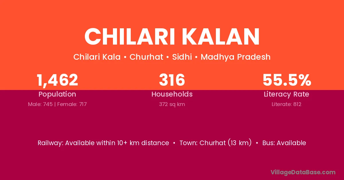 Chilari Kalan village has a total population of 1,462 people, of which 745 are males and 717 are females.