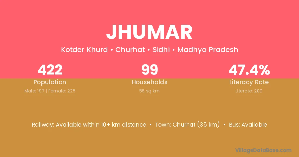Jhumar village has a total population of 422 people, of which 197 are males and 225 are females.