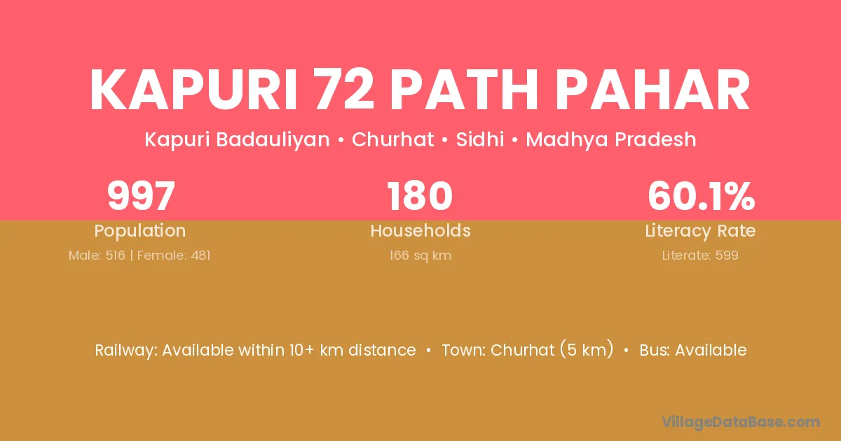 Kapuri 72 Path Pahar village has a total population of 997 people, of which 516 are males and 481 are females.