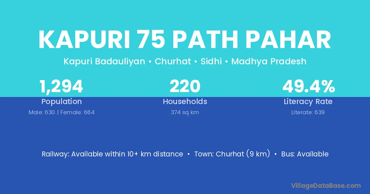 Kapuri 75 Path Pahar village has a total population of 1,294 people, of which 630 are males and 664 are females.