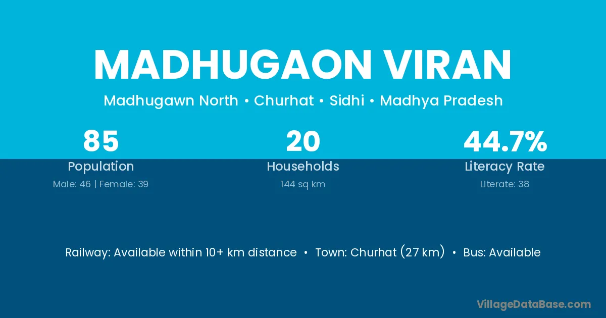 Madhugaon Viran village has a total population of 85 people, of which 46 are males and 39 are females.
