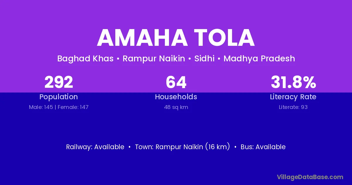 Sidhi (45 km) is the nearest town to Amaha Tola village for major economic activities and is located approximately 45 km away.