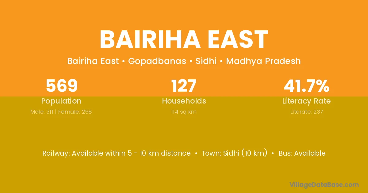 Sidhi (10 km) is the nearest town to Bairiha East village for major economic activities and is located approximately 10 km away.