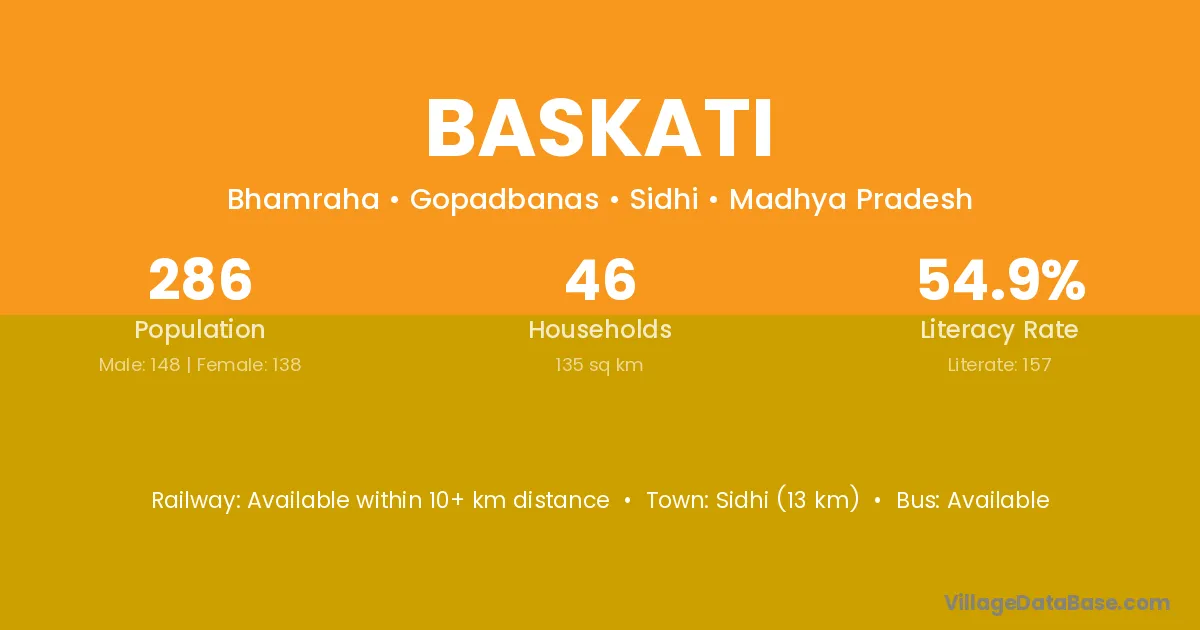 Sidhi (13 km) is the nearest town to Baskati village for major economic activities and is located approximately 13 km away.