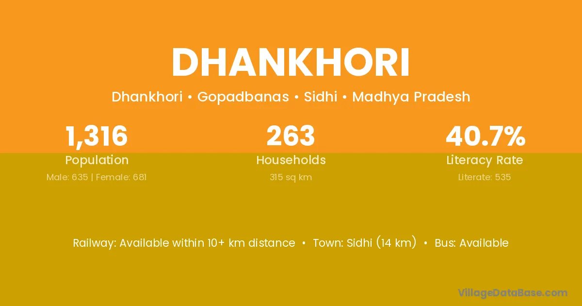 Sidhi (14 km) is the nearest town to Dhankhori village for major economic activities and is located approximately 14 km away.