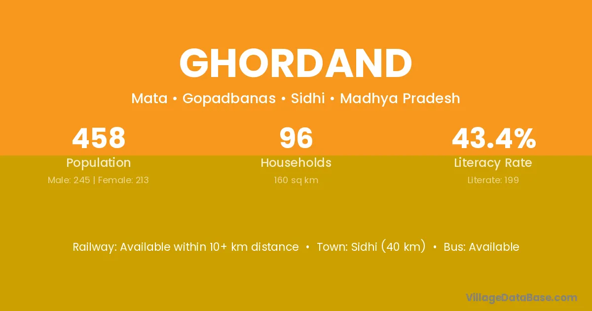 Sidhi (40 km) is the nearest town to Ghordand village for major economic activities and is located approximately 40 km away.