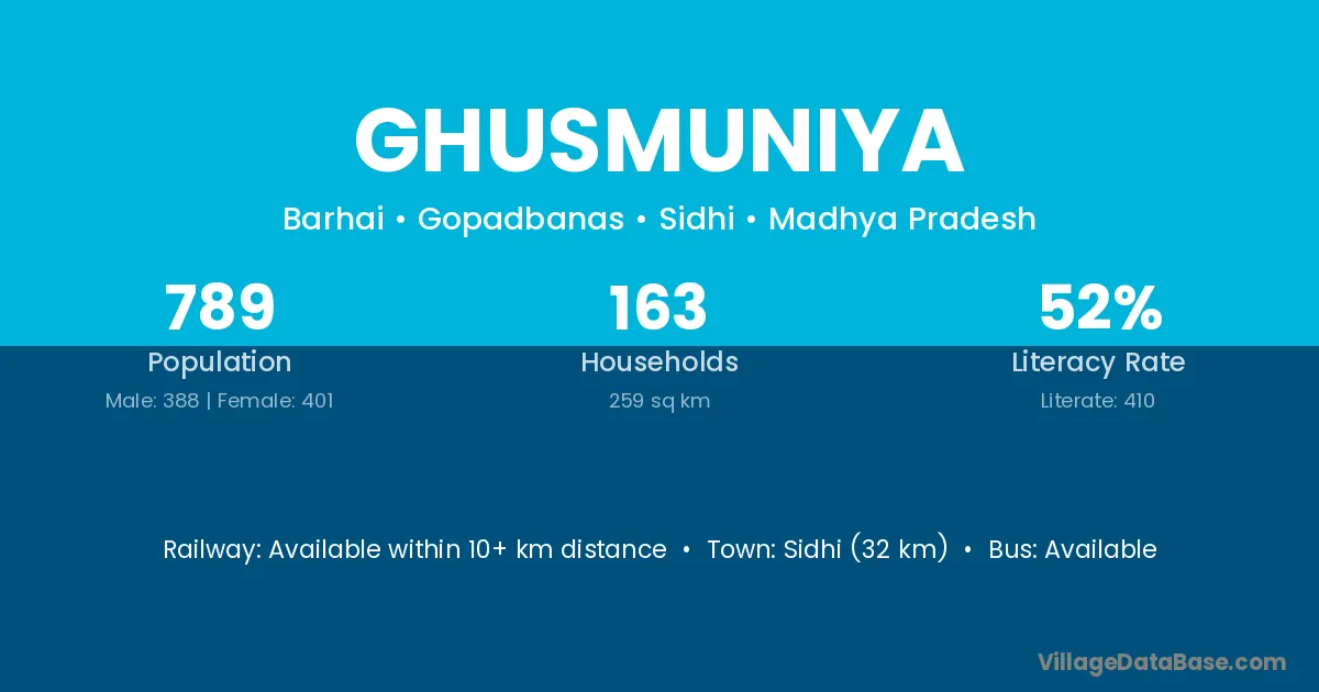 Sidhi (32 km) is the nearest town to Ghusmuniya village for major economic activities and is located approximately 32 km away.