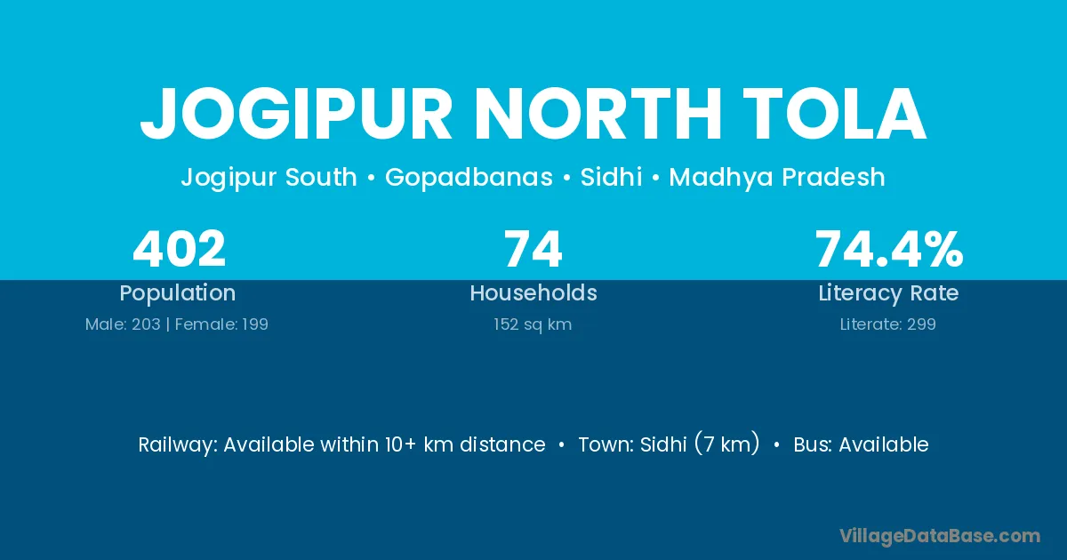 Sidhi (7 km) is the nearest town to Jogipur North Tola village for major economic activities and is located approximately 7 km away.