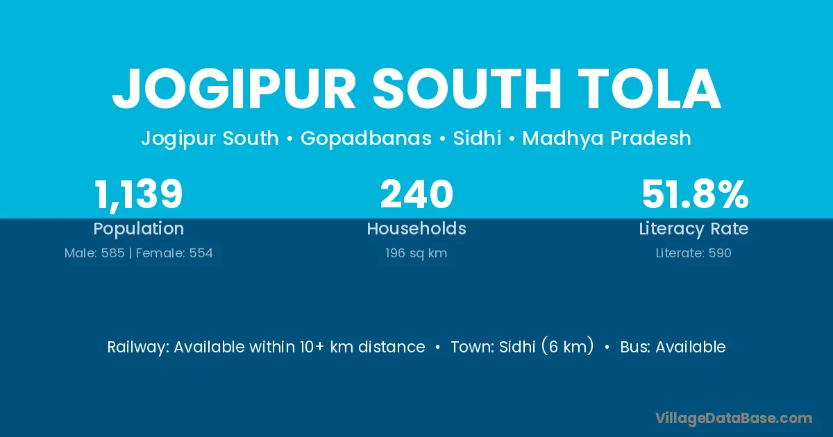 Sidhi (6 km) is the nearest town to Jogipur South Tola village for major economic activities and is located approximately 6 km away.