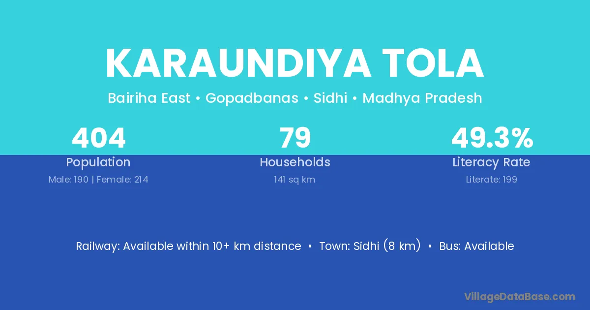 Karaundiya Tola village has a total population of 404 people, of which 190 are males and 214 are females.