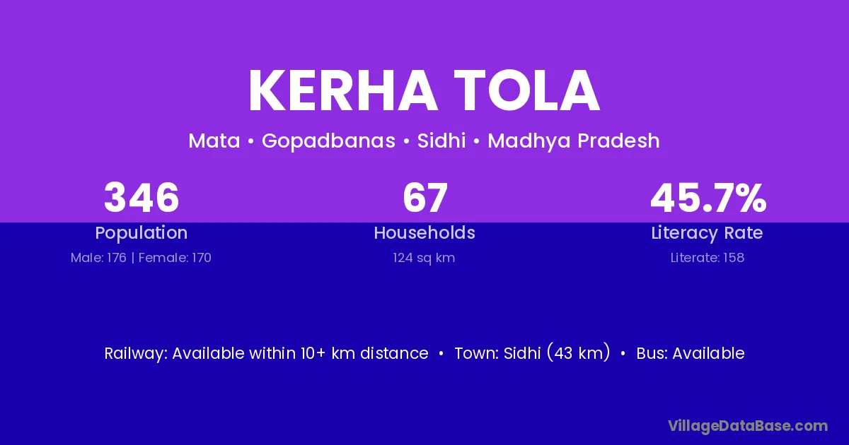 Sidhi (43 km) is the nearest town to Kerha Tola village for major economic activities and is located approximately 43 km away.