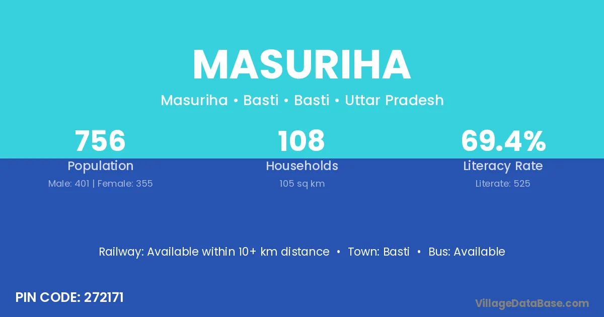 The literacy rate of Masuriha village is 59.01%. Male literacy stands at 63.39% and female literacy at 54.55%.