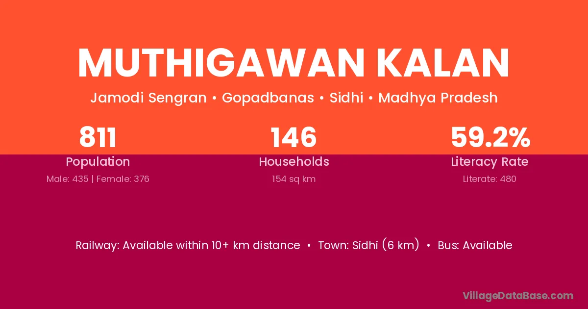 Sidhi (6 km) is the nearest town to Muthigawan Kalan village for major economic activities and is located approximately 6 km away.