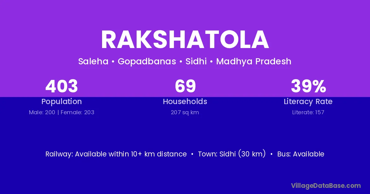 Sidhi (30 km) is the nearest town to Rakshatola village for major economic activities and is located approximately 30 km away.