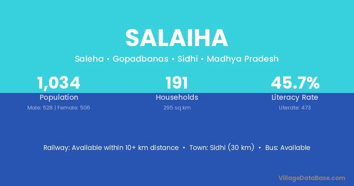 Sidhi (30 km) is the nearest town to Salaiha village for major economic activities and is located approximately 30 km away.