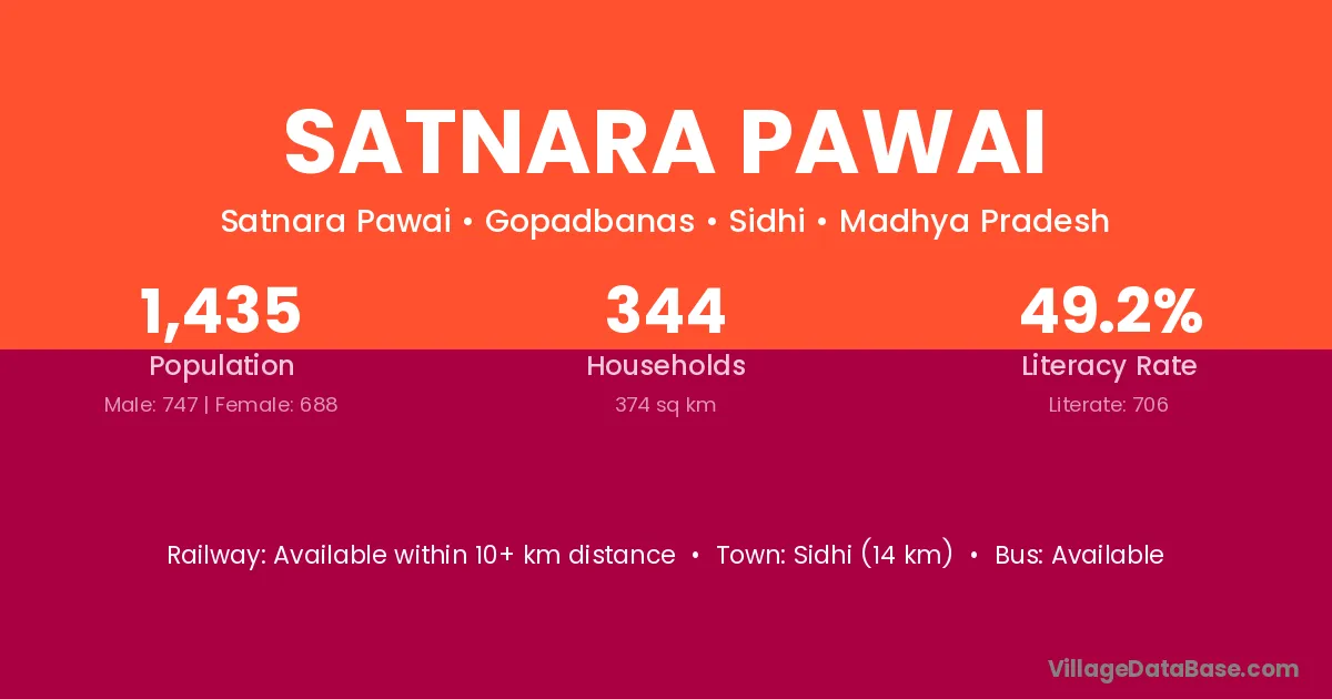 Sidhi (14 km) is the nearest town to Satnara Pawai village for major economic activities and is located approximately 14 km away.