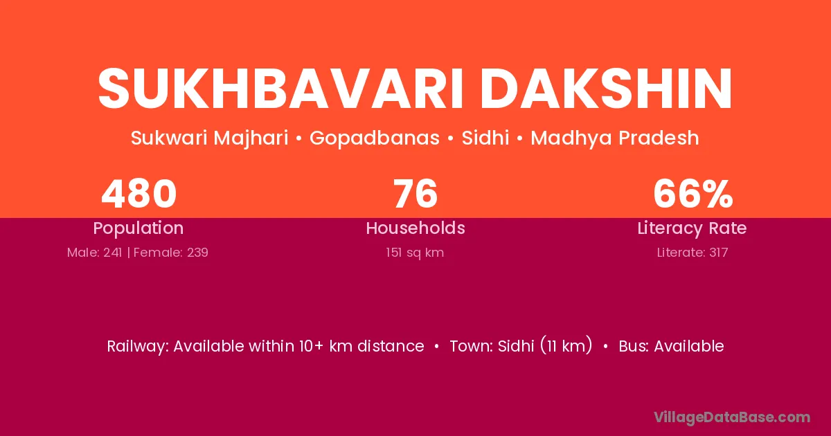 Sukhbavari Dakshin village has a total population of 480 people, of which 241 are males and 239 are females.
